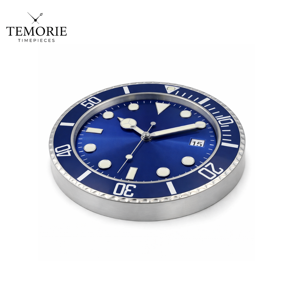 Relógio de Parede Diver Azul 35cm silencioso, inspirado nos clássicos relógios de mergulho de luxo, com mostrador metálico azul intenso e moldura esportiva elegante, ideal para transformar qualquer ambiente com um toque moderno e sofisticado.